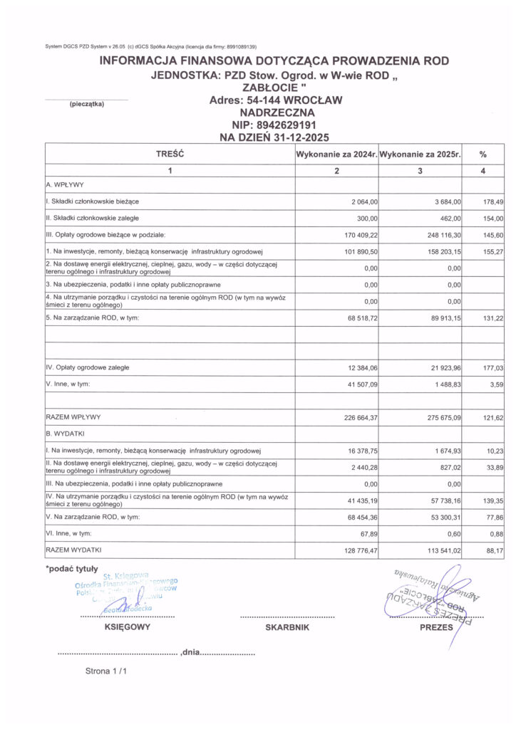 Sprawozdanie finansowe 2025 Nawigacja wpisu PREVIOUS Previous post: Zebranie DziałkowcówNEXT Next post: Zaproszenie do złożenia oferty na elektryfikacje działek
